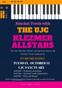 Shabbat Services at 7:00 PM, Dinner following in the UJC Sukkah