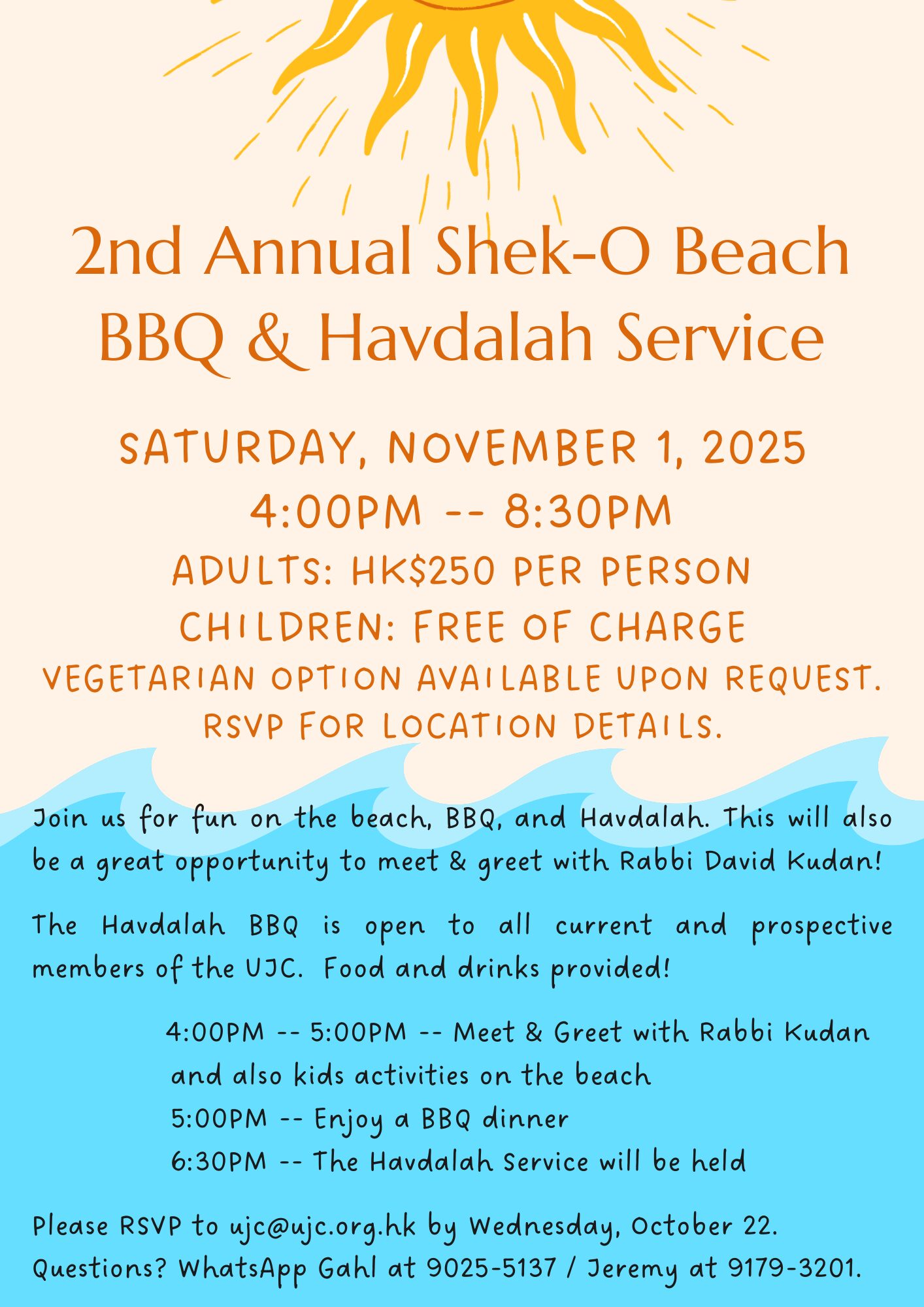 Join us for fun on the beach, BBQ, and Havdalah. This will also be a great opportunity to meet & greet with Rabbi David Kudan! The Havdalah BBQ is open to all current and prospective members of The UJC. Food and drinks provided.