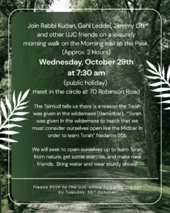 Join Rabbi Kudan, Gahl Leddel, Jeremy Litt and other UJC friends on a leisurely morning walk on the Morning trail to the Peak. (Approx. 2 Hours)