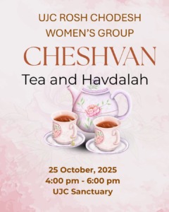 Join the UJC Rosh Chodesh women’s group on Saturday, 25th October from 4:00 pm – 6:00pm for Tea and Havdalah. A guaranteed meaningful time for all. RSVP to Cantor Shore by Friday, 17th October.